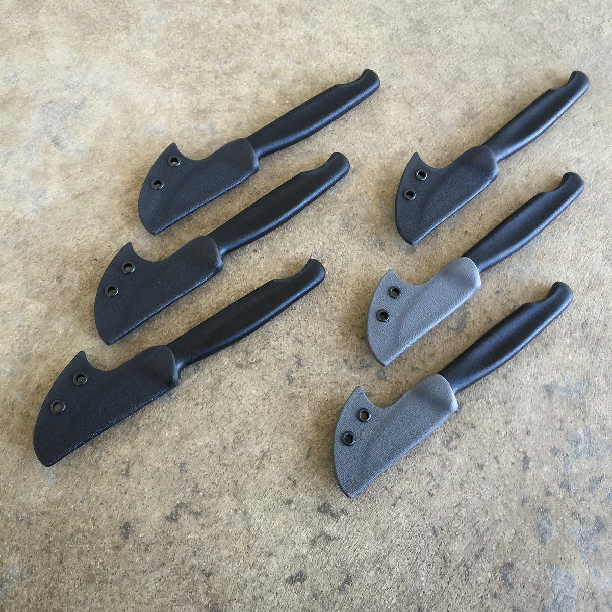 This package includes a Victorinox fruit knife that I have added a peeling index to the handle of, improving dexterity and control when held with the edge facing inwards. Each knife has been fitted with an individually molded pocket sheath. The pocket sheath hooks the front edge of the pocket, allowing the knife to clear the sheath as it is withdrawn.